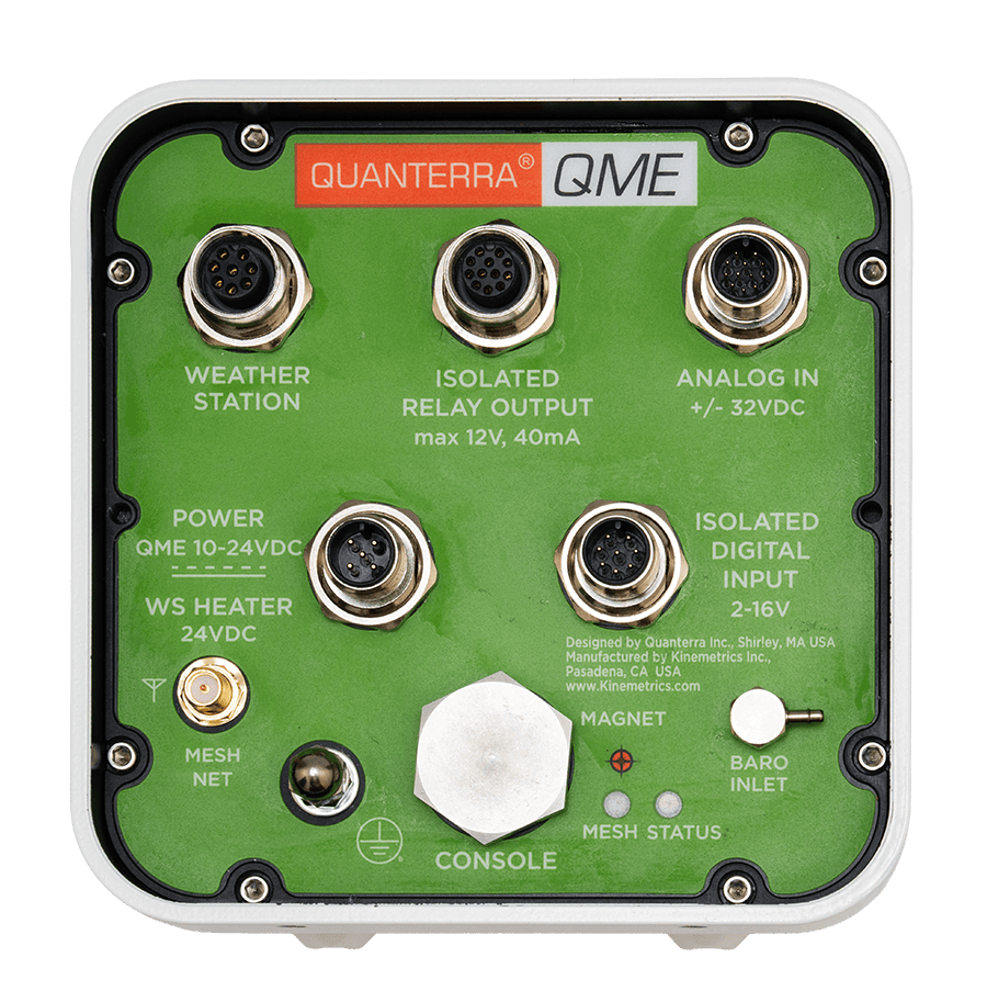 The QME is a secure wireless peripheral for the Quanterra® Q8 ultra-high resolution data acquisition system. The QME enables the mesh network capabilities of the Q8, wirelessly extending its reach to weather stations and other critical sensors.